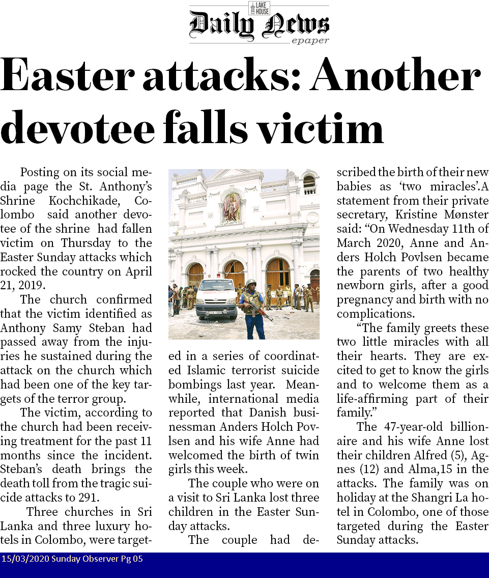 Easter attacks : Another devotee falls victim